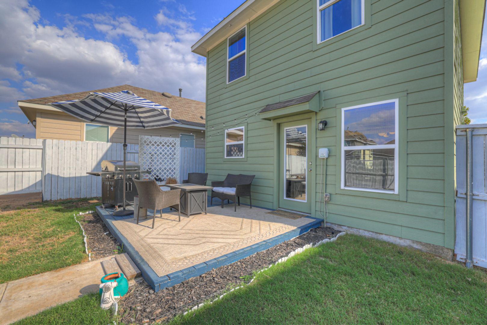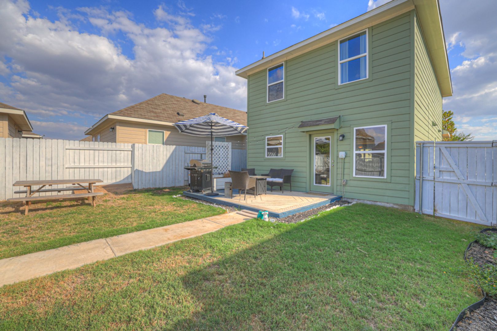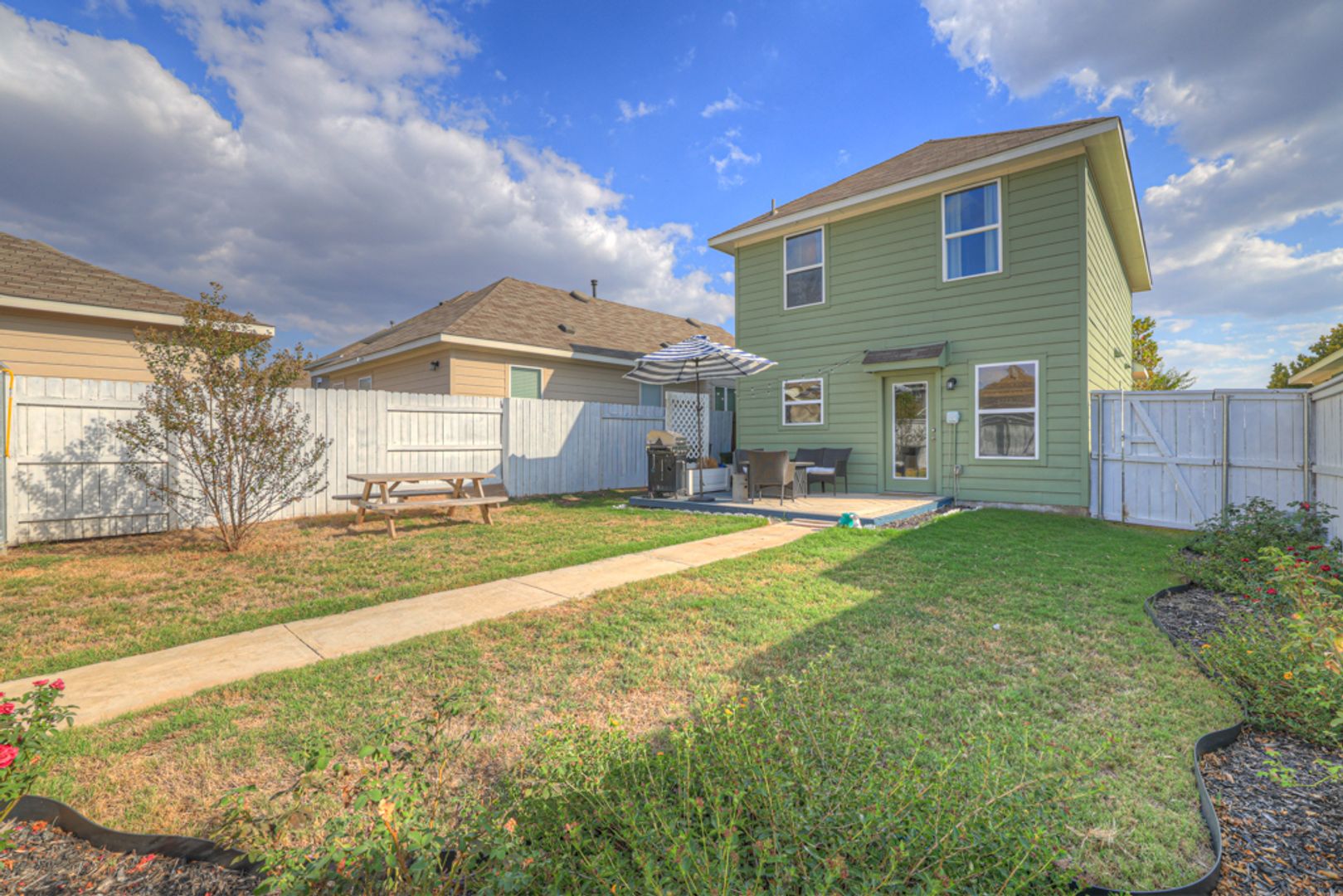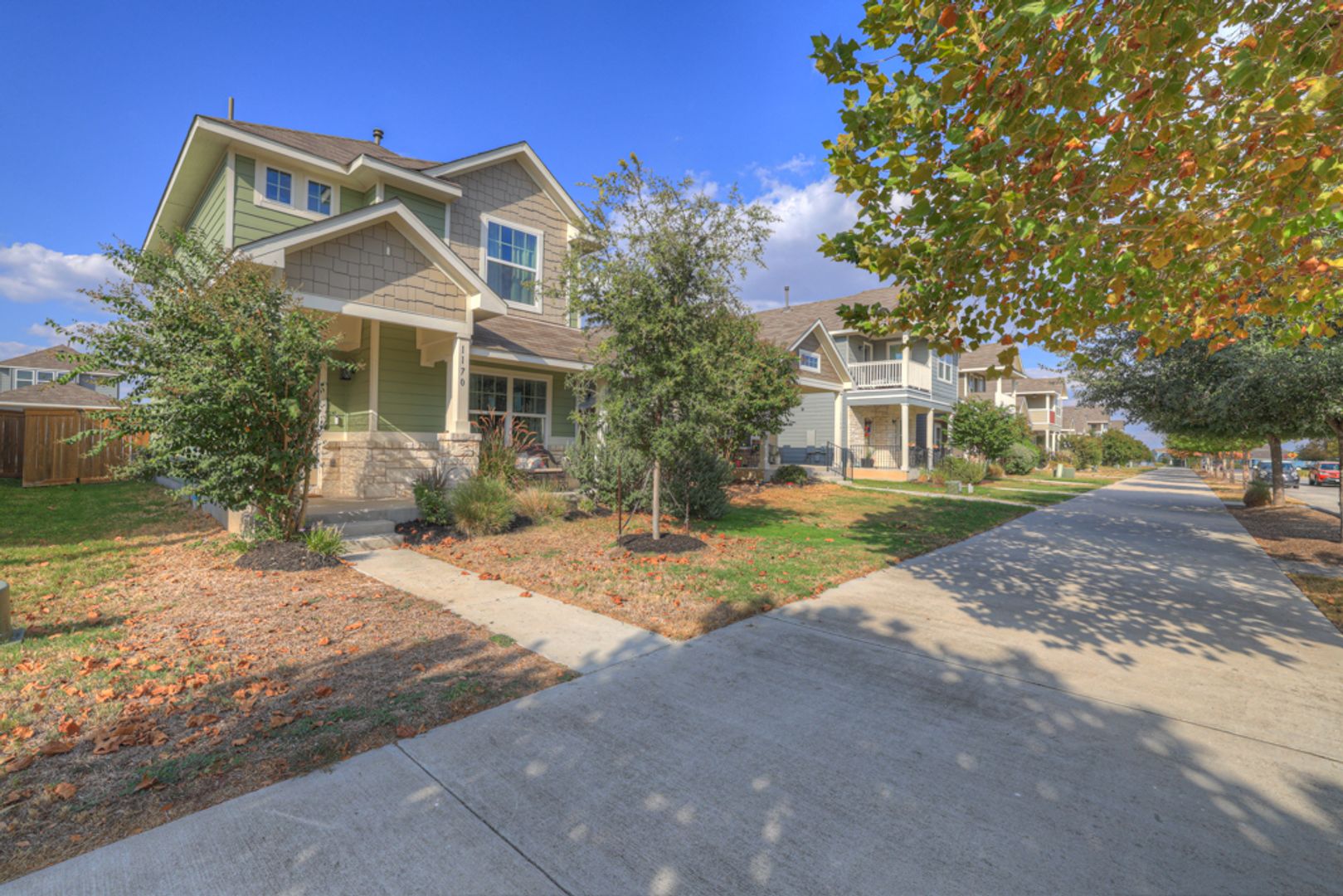 Blending both comfort and community, this thoughtfully designed, well maintained, home offers the perfect setting to unwind, entertain, and enjoy all that the thriving Trace neighborhood has to offer. Just steps from the Presidio Amenity Center and Rodriguez Elementary School, this charming residence welcomes you with a Craftsman style front porch and 12 foot wide side walks, perfect for decorating, morning coffee, or evening strolls. Inside, you'll be greeted by an open floorpan with large fixed windows offering an abundance of natural light. You'll also find a modern kitchen featuring stainless steel appliances, an elevated light fixture, a spacious pantry, and plenty of counter space, as well as thoughtful details like a half bathroom downstairs and ample under the stairs storage. Upstairs, the primary suite is a relaxing retreat with a ceiling fan, a large window that fills the space with natural light, and an ensuite, accompanied by two additional bedrooms perfect for family, guests, or a home office, and a full bathroom. This home is complete with the perfect outdoor entertaining space featuring a deck and fully fenced backyard, ideal for weekend cookouts or a quiet evening under the Texas stars. Nestled in the picturesque Trace community with a resort style pool, covered pavilion, basketball and sand volleyball courts, scenic nature trails, and beautiful parks throughout, easy access to I-35, Texas State University and shopping, this home is ready for its next chapter!