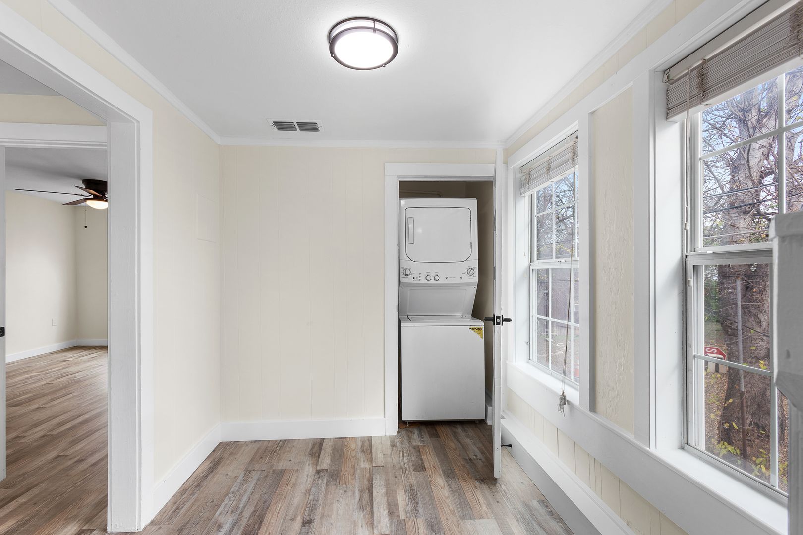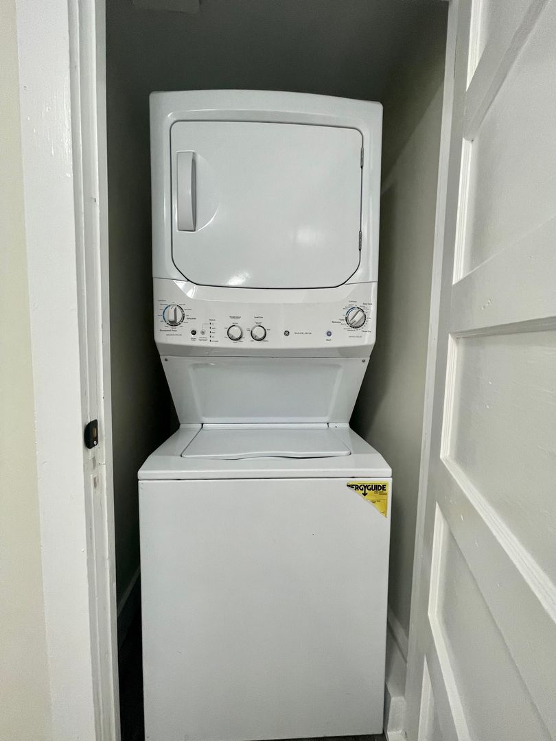 This bright and welcoming upstairs residence offers a spacious one-bedroom, one-bathroom layout filled with natural light. The unit features a generous walk-in closet, hard-surface flooring throughout for a modern, low-maintenance finish, and a functional kitchen equipped with stainless steel appliances. An in-unit washer and dryer add everyday convenience, while central heating and air conditioning ensure year-round comfort.
