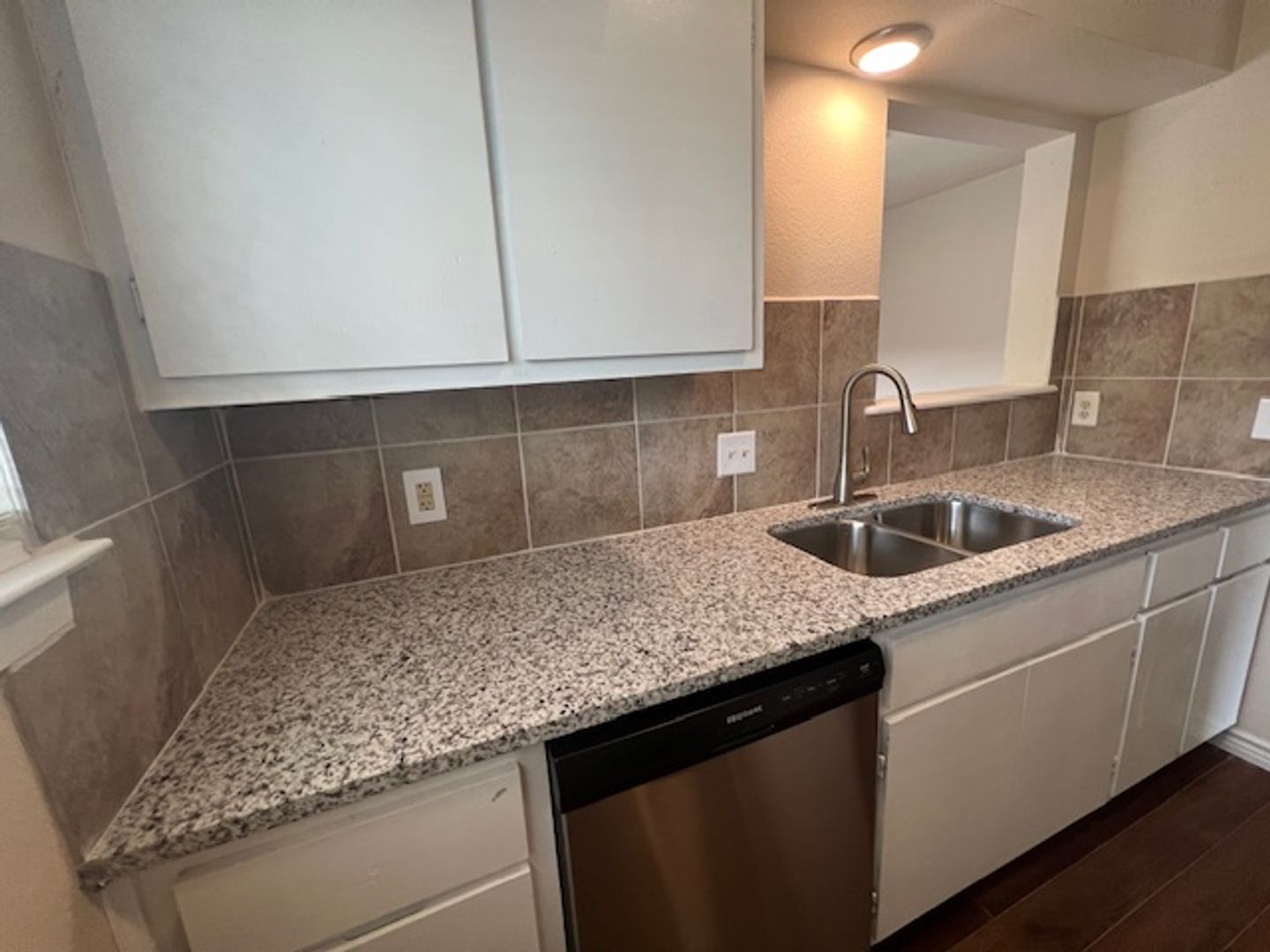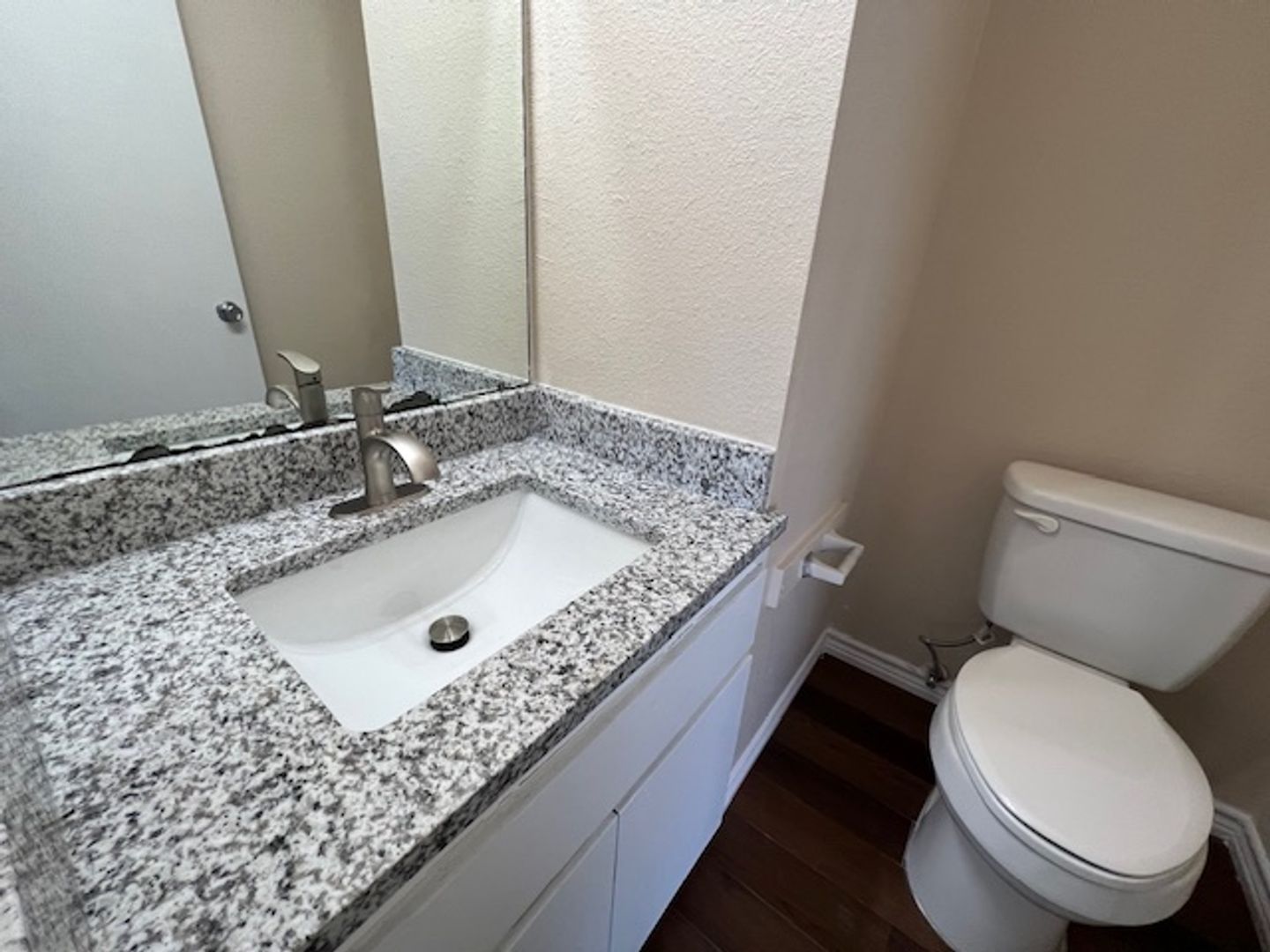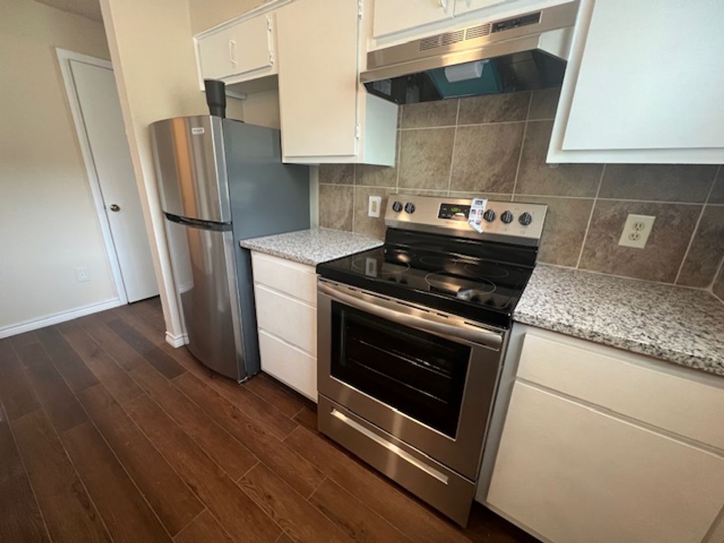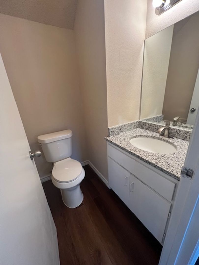 Inside, you'll love the modern finishes: durable hard-surface flooring throughout, a well-equipped kitchen with stainless steel appliances and elegant granite countertops, and a practical layout with the living, dining, and half-bath downstairs, plus both bedrooms and a full bath upstairs. Stay comfortable year-round with central air conditioning and heating, complemented by ceiling fans for added breeze.