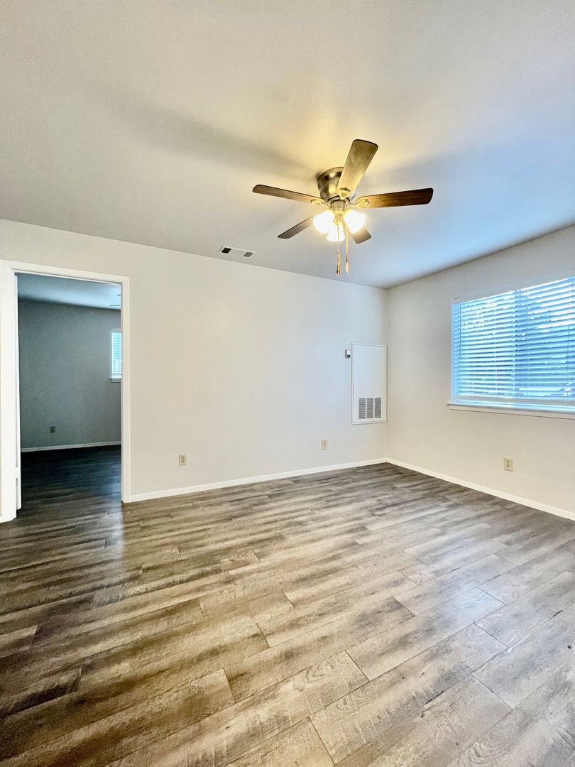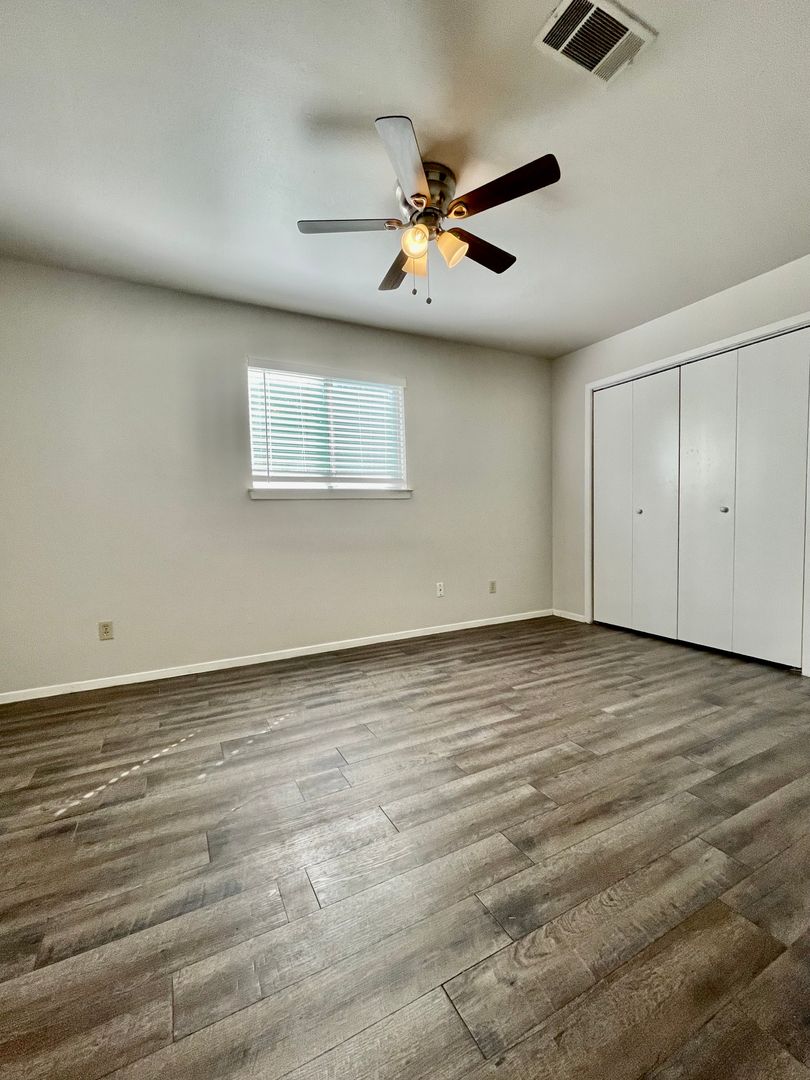 This charming 1-bedroom, 1-bathroom unit features hard vinyl plank flooring throughout, making cleaning a breeze. Featuring an open living space ideal for relaxation and entertaining. The spacious bedroom includes double closets, providing ample storage for all your needs. Enjoy the convenience of parking right outside your door and the comfort of ceiling fans in every room to keep cool. Relax on your private covered front patio, perfect for unwinding after a long day.